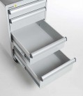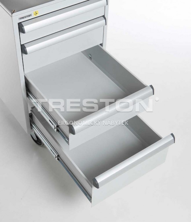 Centrálně uzamykatelké zásuvkové jednotky z vysoce kvalitní oceli nabízí prostor pro skladování nástrojů a malých součástek. Montují se pomocí držáků pod desku stolu. K dispozici jsou také verze s kolečky či soklem. Zásuvkové skříňky jsou pokryty epoxidovou ochrannou vrstvou (šedá, RAL 7035), centrálním zamykáním a úchytkou z anodizovaného hliníků po celé šířce zásuvky.